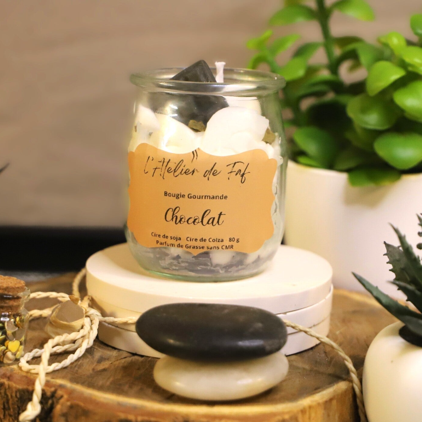 🍫 Fabrication artisanale, en Bretagne. Créée avec des produits sains et de qualités : 100% Cire végétale de Soja et de Colza sans OGM, Parfum de Grasse garantie sans CMR, Mèche de Coton et Colorants en grains naturels, pot en verre recyclé.