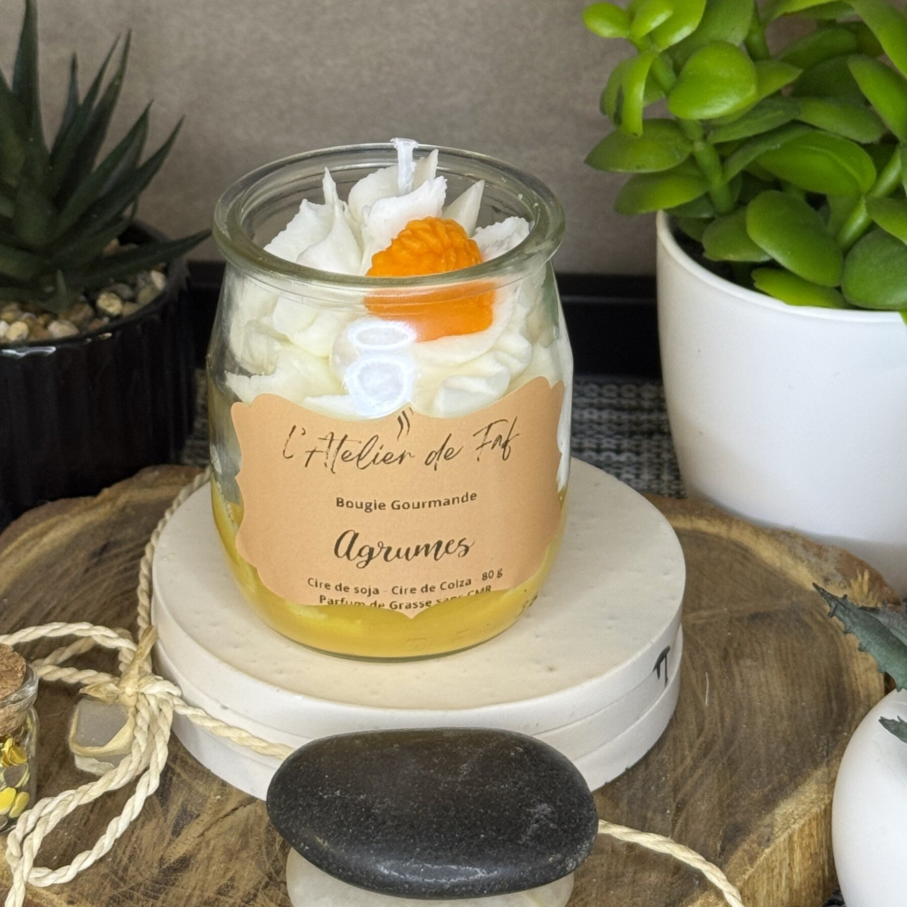 🍊🍋 Fabrication artisanale, en Bretagne. Créée avec des produits sains et de qualités : 100% Cire végétale de Soja et de Colza sans OGM, Parfum de Grasse garantie sans CMR, Mèche de Coton et Colorants en grains naturels, pot en verre recyclé.