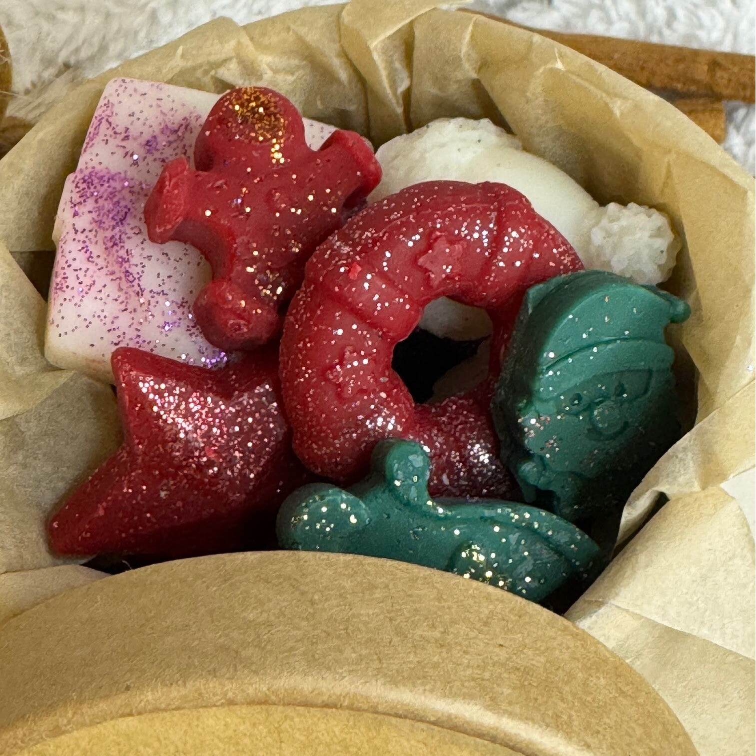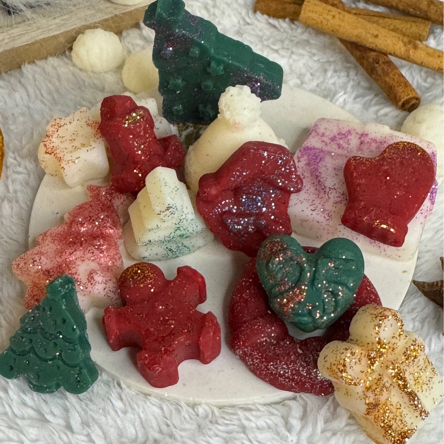 🎁 Plusieurs fondants avec des formes différentes sur le thème de Noël, rouge, blanc et vert avec des paillettes biodégradables de couleurs variées pour un poids total de 90g environ